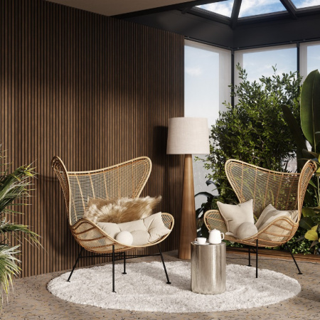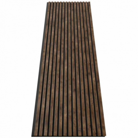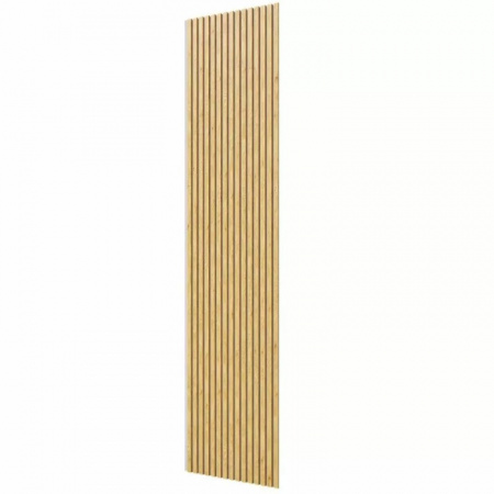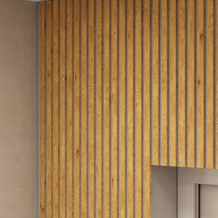 Изготовлен из экологичного волокна, устойчив к влаге, долговечен, воздухопроницаем, преломляет и подавляет звуковые волны. Декор панелей – рейки из мебельного МДФ, облицованные экошпоном: устойчивы к деформации, создают визуальный и тактильный эффект комфорта. Аналог деревянной рейки для стен в интерьере.